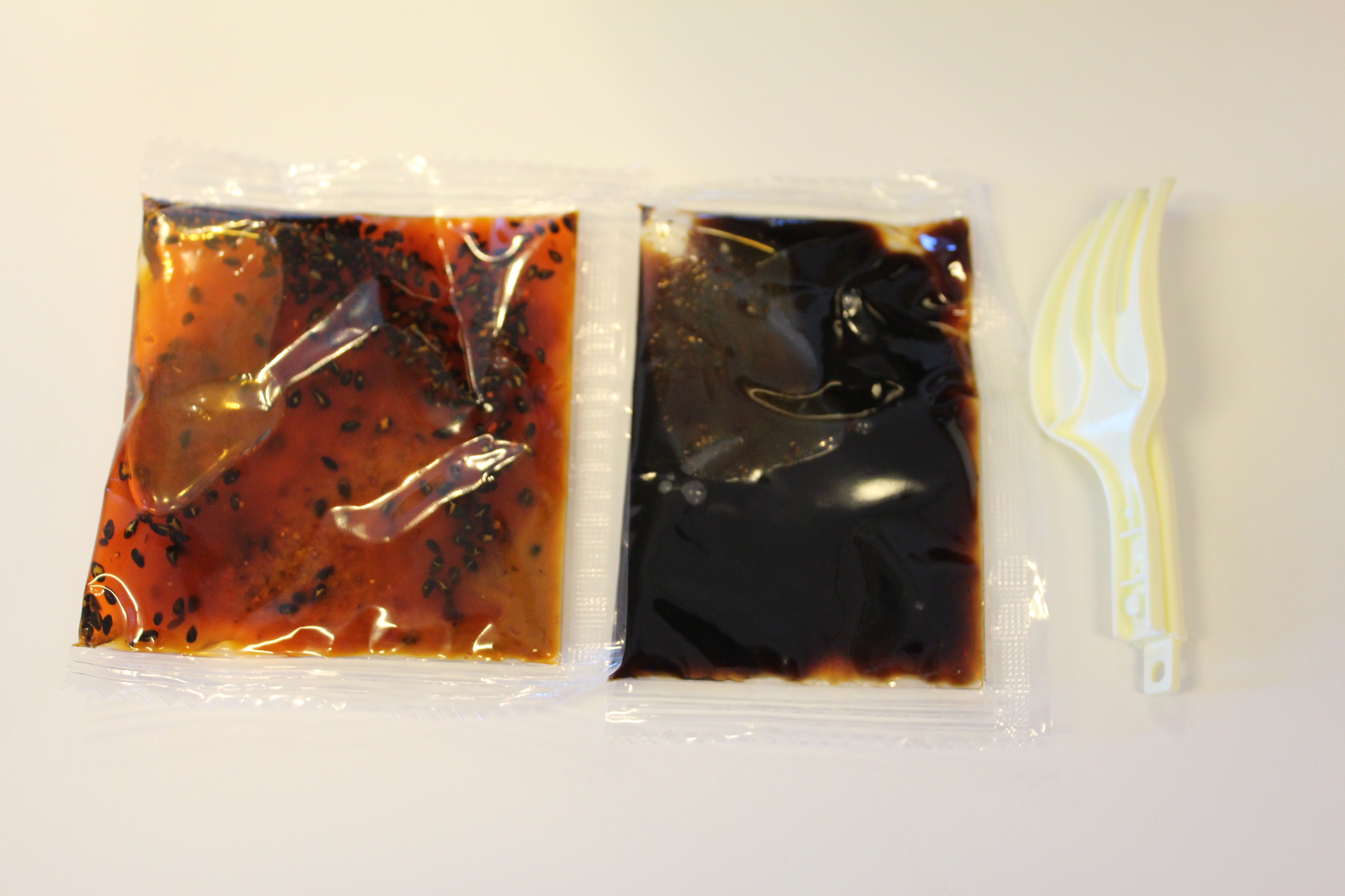 액체 수프, 식초, 플라스틱 포크가 들어 있어요.