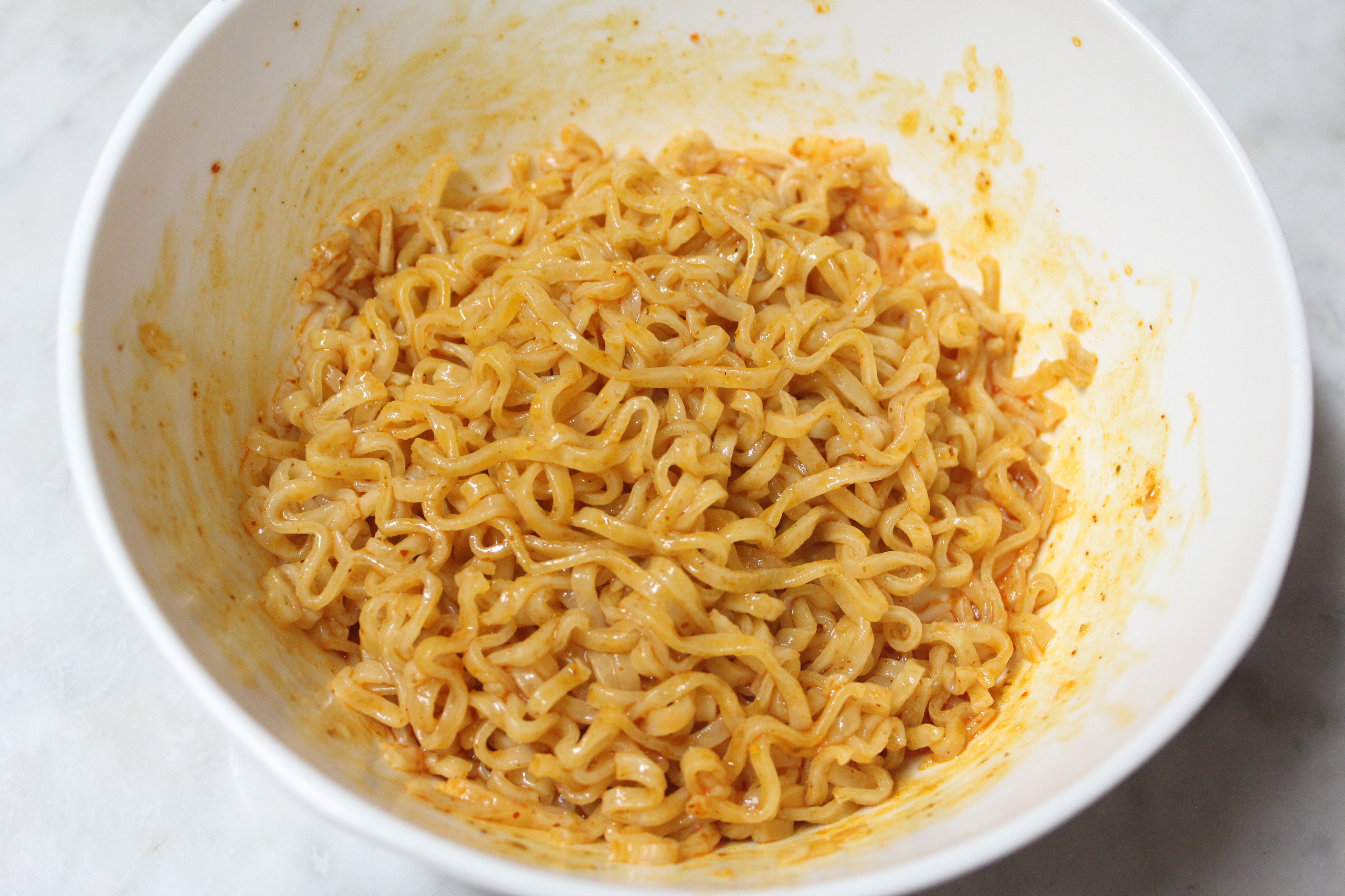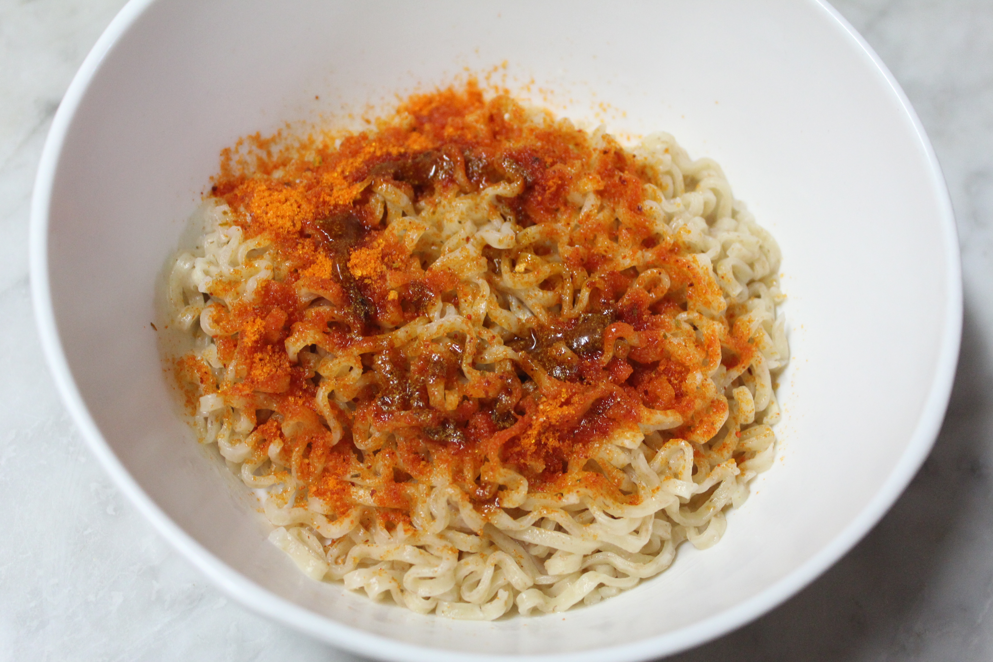 그리고 준비한 그릇에 면과 분말 수프, 향미유를 넣고, 잘 비벼 먹으면 돼요.
