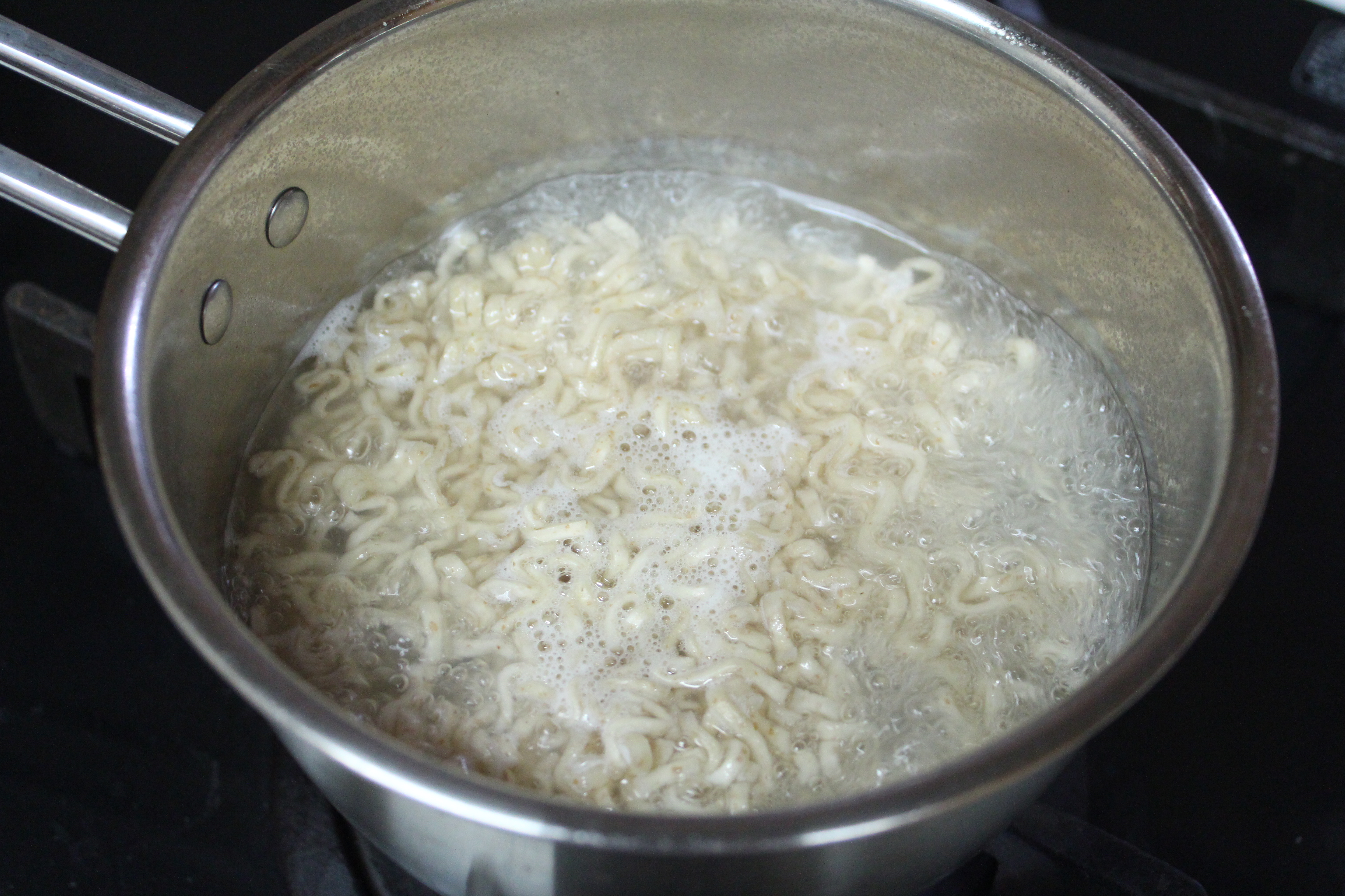 끓는 물에 면을 3분 삶은 후, 물을 버려요.