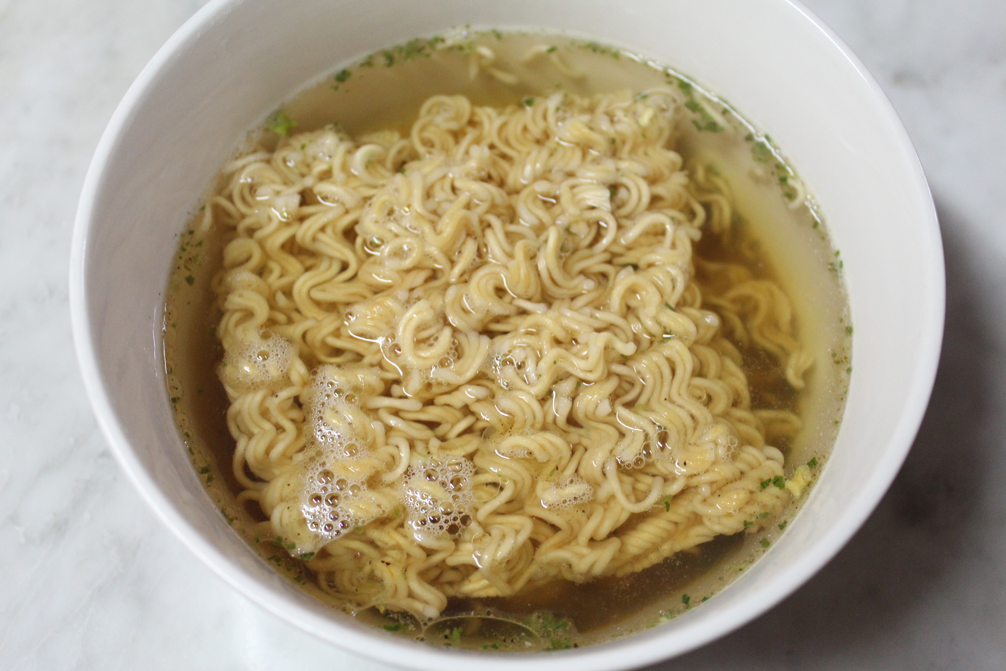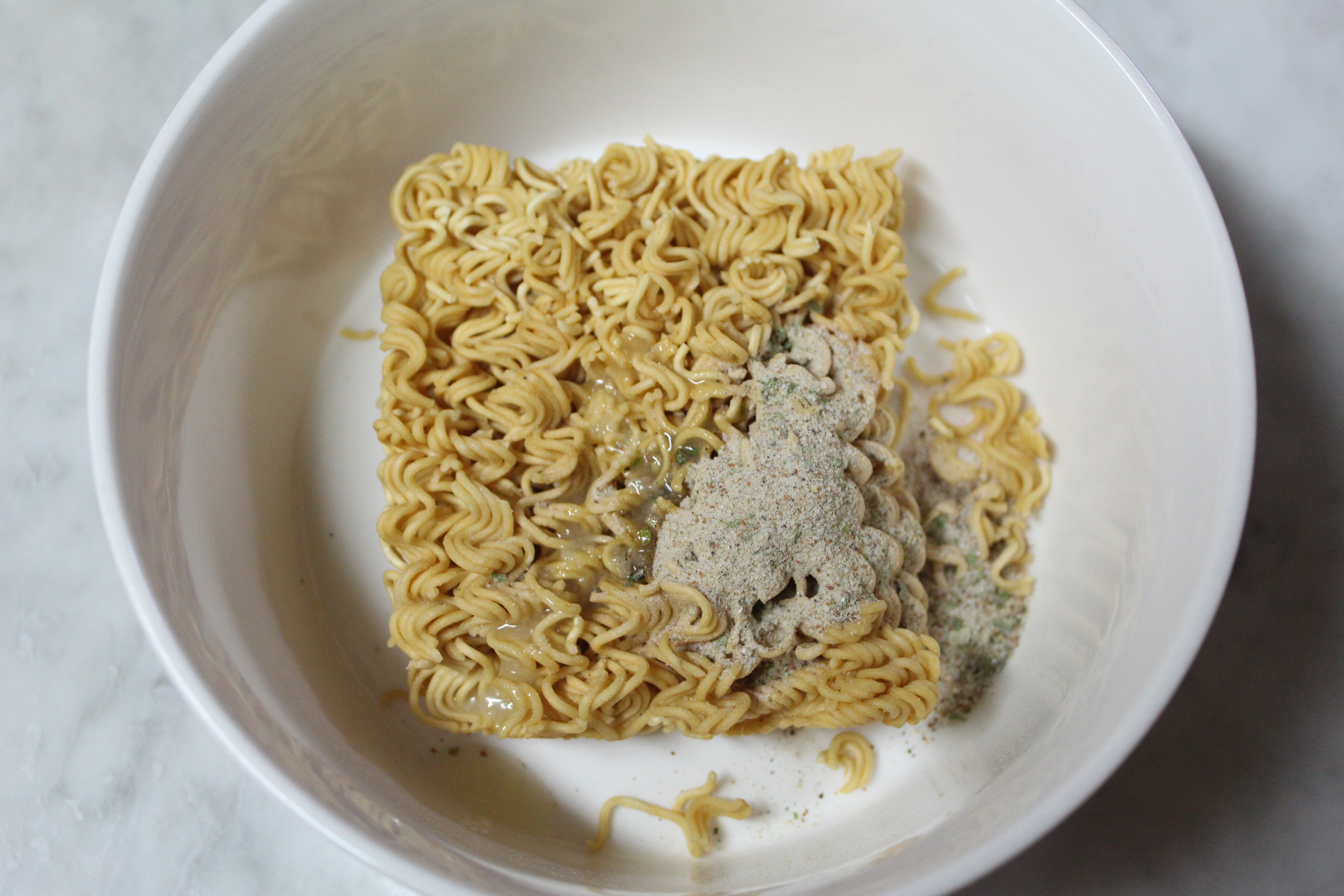 면 위에 분말 수프, 향미유를 올려 놓고, 뜨거운 물 320ml를 부었어요.