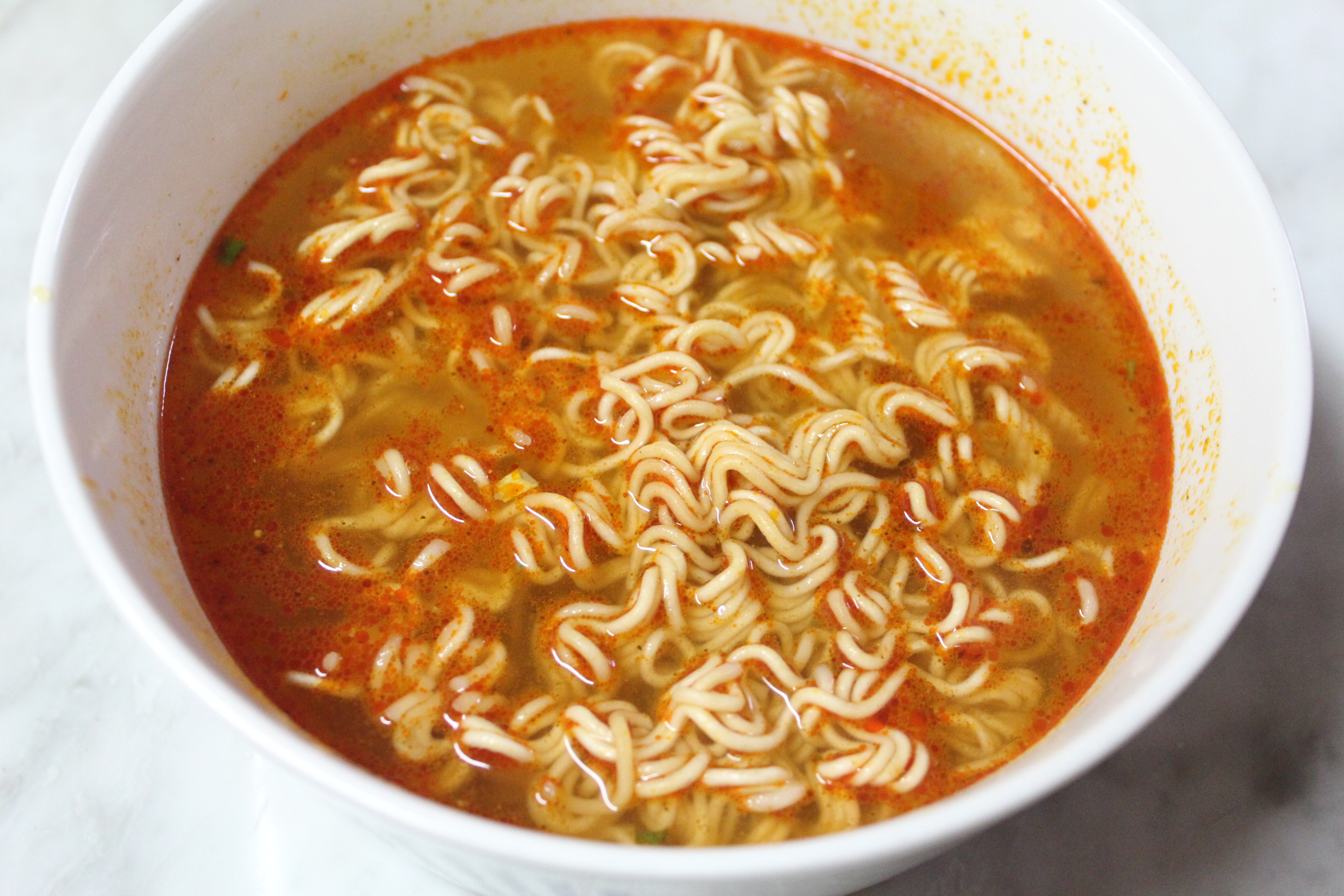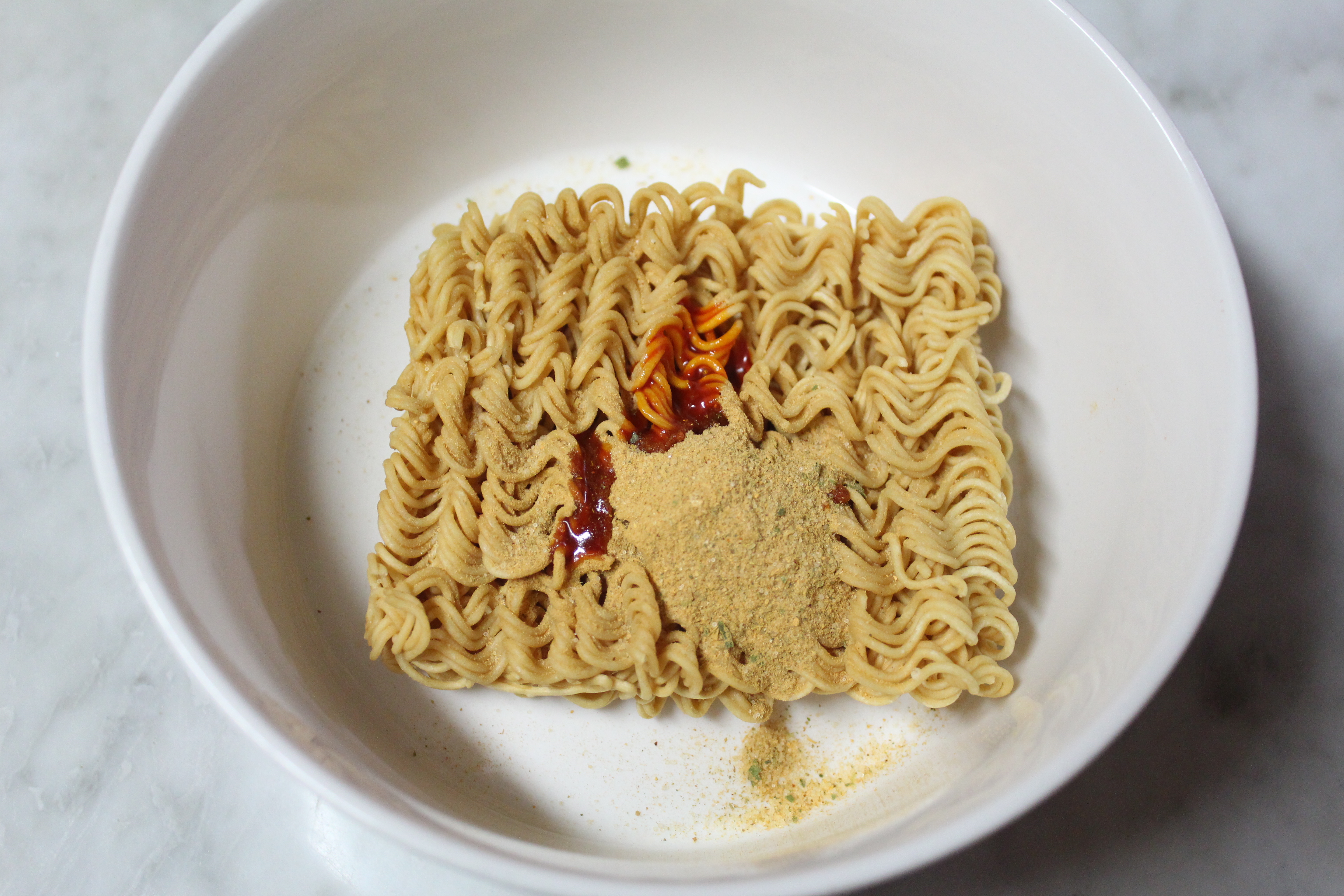 면 위에 분말 수프, 향미유를 올려 놓고, 뜨거운 물 320ml를 부었어요.